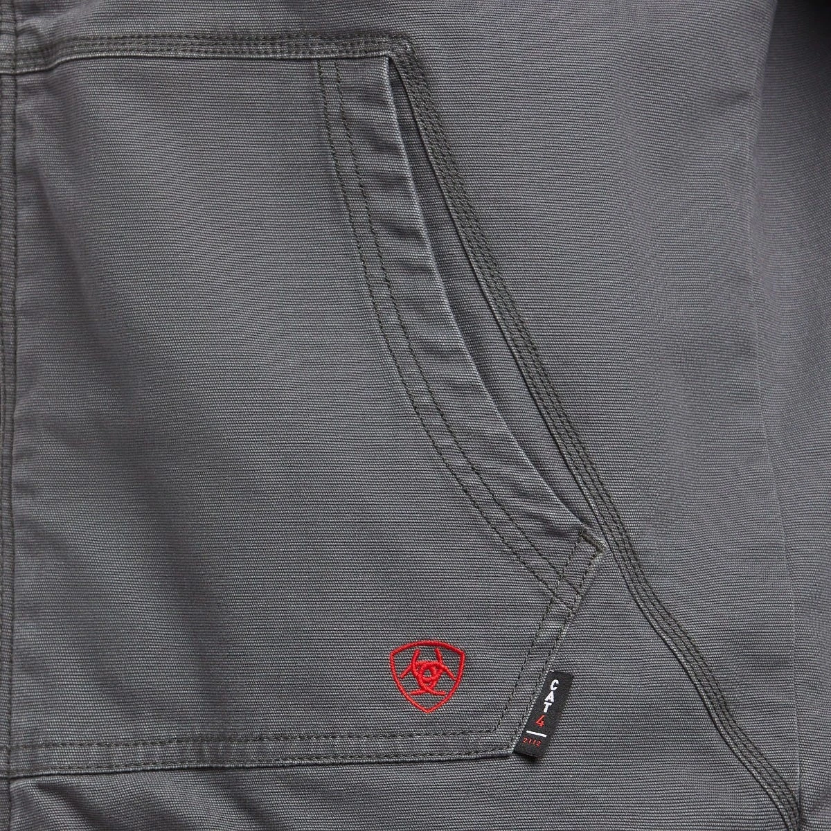 Where does that warmth come from that we were talking about? A 9-ounce FR polar fleece lining adds warmth to the interior of the Iron grey men’s jacket. 74% cotton, 24% nylon, and 2% spandex make up the DuraLight material. This stretch canvas design is triple-needle stitched for increased durability, and a Greater Arm seam construction was used to give you a maximum range of motion. This unique cotton/nylon stretch canvas material also offers 3X the abrasion resistance and an even greater freedom to move about during your workdays. For convenient storage, Ariat designers included a zippered chest pocket.Â