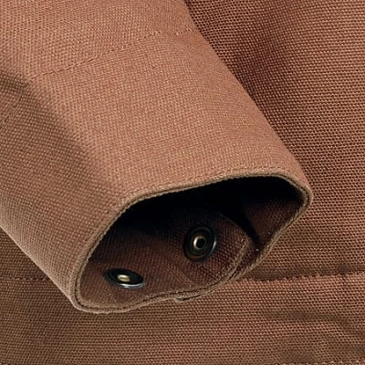 The 12 ounce 100 percent cotton duck cloth makes this jacket extra durable. Triple-needle stitching on the shoulders and armholes of the jacket reinforce these heavy-movement areas. The brown, corduroy collar gives you sturdy coverage around your neck.