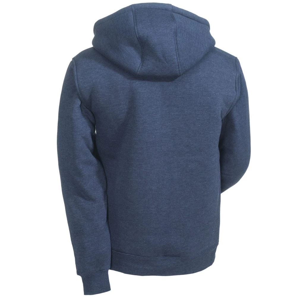 For even more warmth and weather-beating performance, this heavy duty navy hooded jacket comes with 2-ounce polyfill in the sleeves and a Durable Water Repellent (DWR) finish on the exterior. The lightweight polyfill adds warmth without weight. The DWR finish resists light rain and moisture so you can work harder in inclement weather. The hood with dyed-to-match drawcord lets you keep you head warm and dry. That should make you happy.
