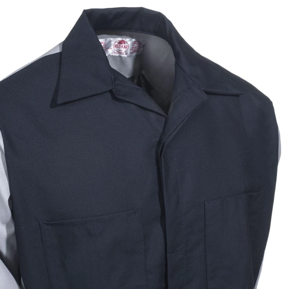 You’re at work wearing one of your favorite work shirts. As you go about your business your sleeve gets caught, and now there’s a big tear in your favorite tee shirt. Ugh! This probably all could have been avoided if you had been wearing this ~Red Kap Men’s SY10 NG Navy/Grey Ripstop Long Sleeve Shirt.