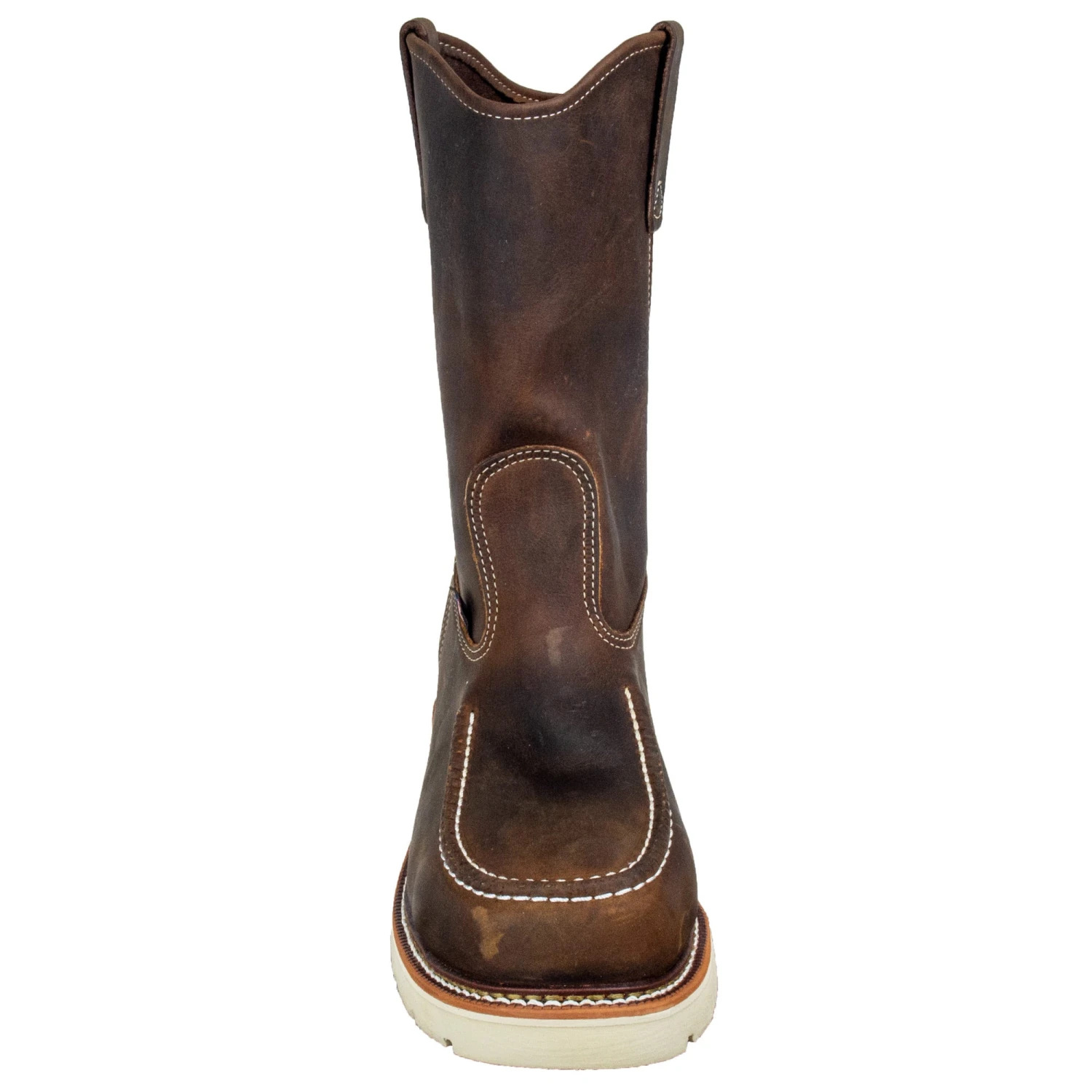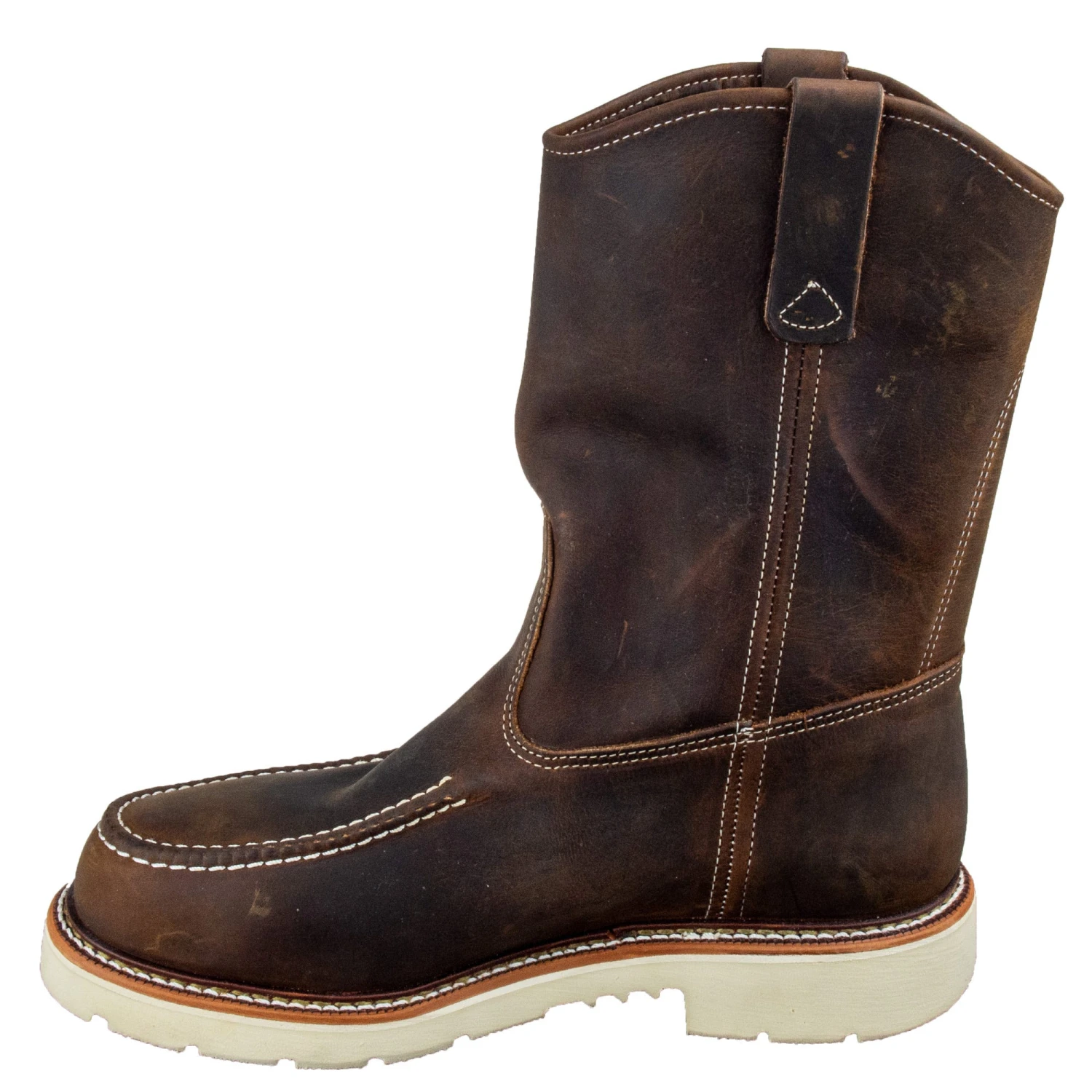 For a men’s work boot that provides the features you’re looking for, look no further because we have the ~Men’s Thorogood 11″ Steel Toe Moc Toe Wellington Boot (U.S.A.) 804-3311 from the American Heritage Collection by Thorogood. Are you tired of trading safety and durability for comfort and style? The trade-off ends today, right here right now. Thorogood built you some pull-on steel toe boots with a slip-resistant outsole and EH protection, and they feel great on your feet and are built to last. Plus, Thorogood builds these men’s safety toe boots right here in the U.S.A.