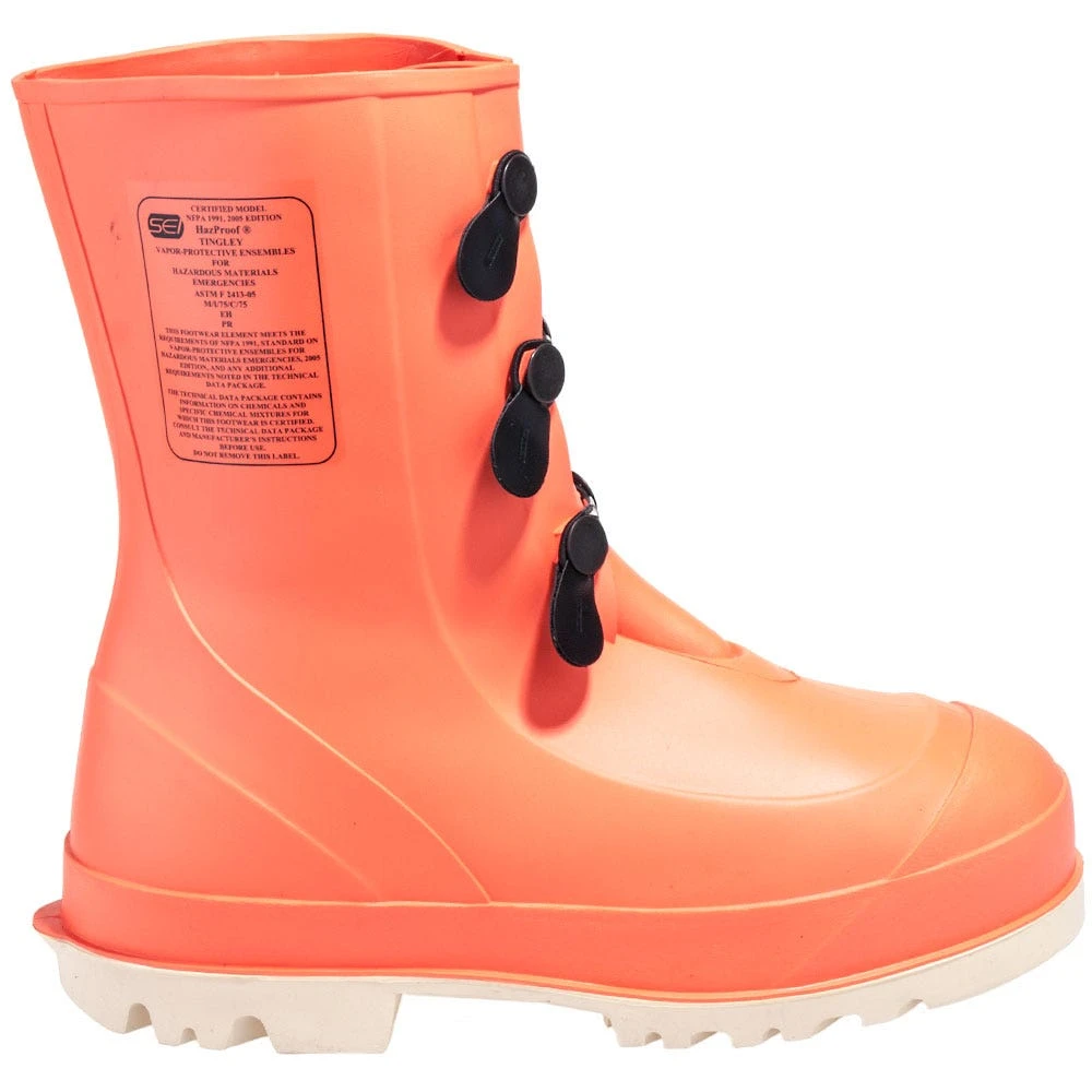 We’re perfectly ready to back up this strong language, starting with the bright orange color of these Tingley boots. Notice how easy to see these hi-vis boots are and how they grab the eye. That’s called high-visibility and that keeps you safer. That bold orange is a special polymer material that meets NFPA 1991 standards for chemical permeation.